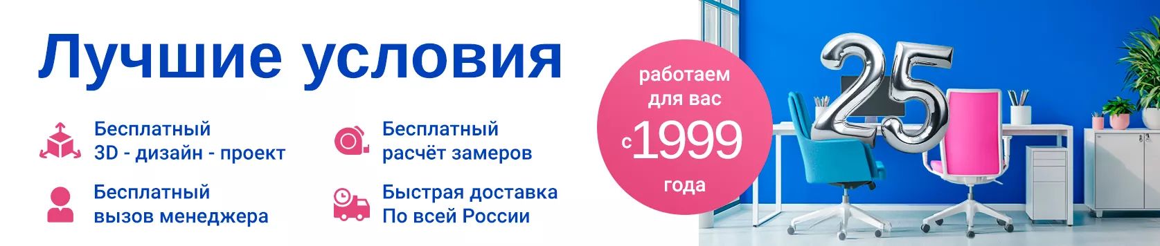 На протяжении 25 лет наша офисная мебель заполняет тысячи офисов по всей стране. В каталоге интернет-магазина представлен весь ассортимент мебели от кабинета руководителя до рабочего места сотрудника. Большой опыт работы позволяет нам с уверенностью продавать качественную мебель для офиса от ведущих производителей в России. Наши специалисты помогут грамотно распределить офисную мебель в пространстве кабинета и организовать эффективное рабочее пространство. Мы реализуем как готовые решения для офиса, так и готовы изготовить индивидуальную мебель для вашего офиса на собственном производстве по Вашим эскизам или разработаем индивидуальное решение по техническому заданию в требуемом стиле и цветовой гамме. При этом мебель для офиса будет изготовлена в кратчайшие сроки (до 1 недели).